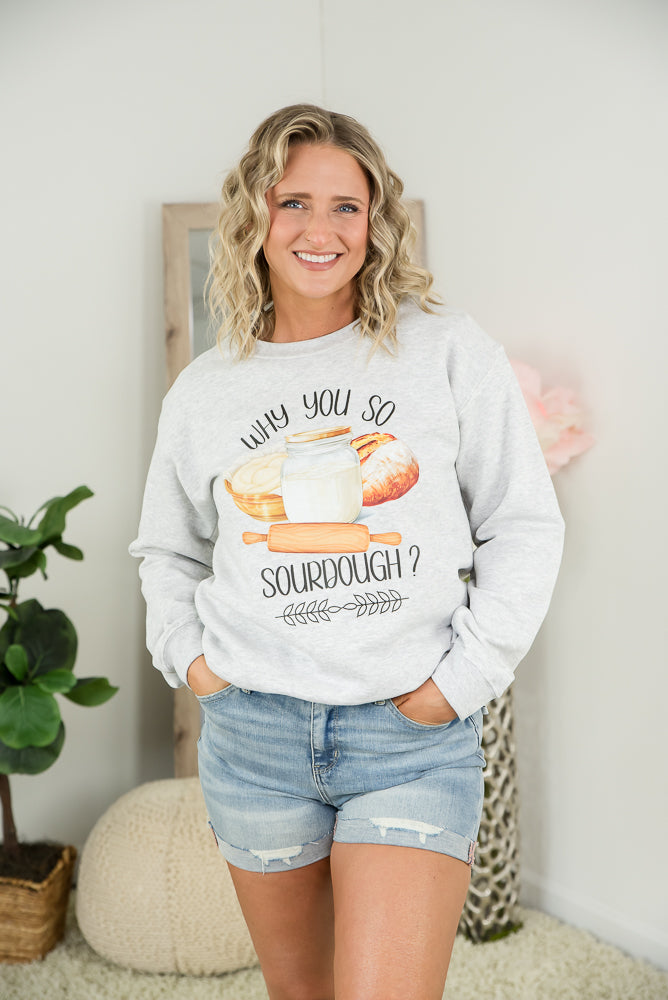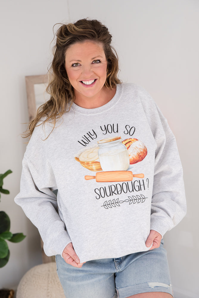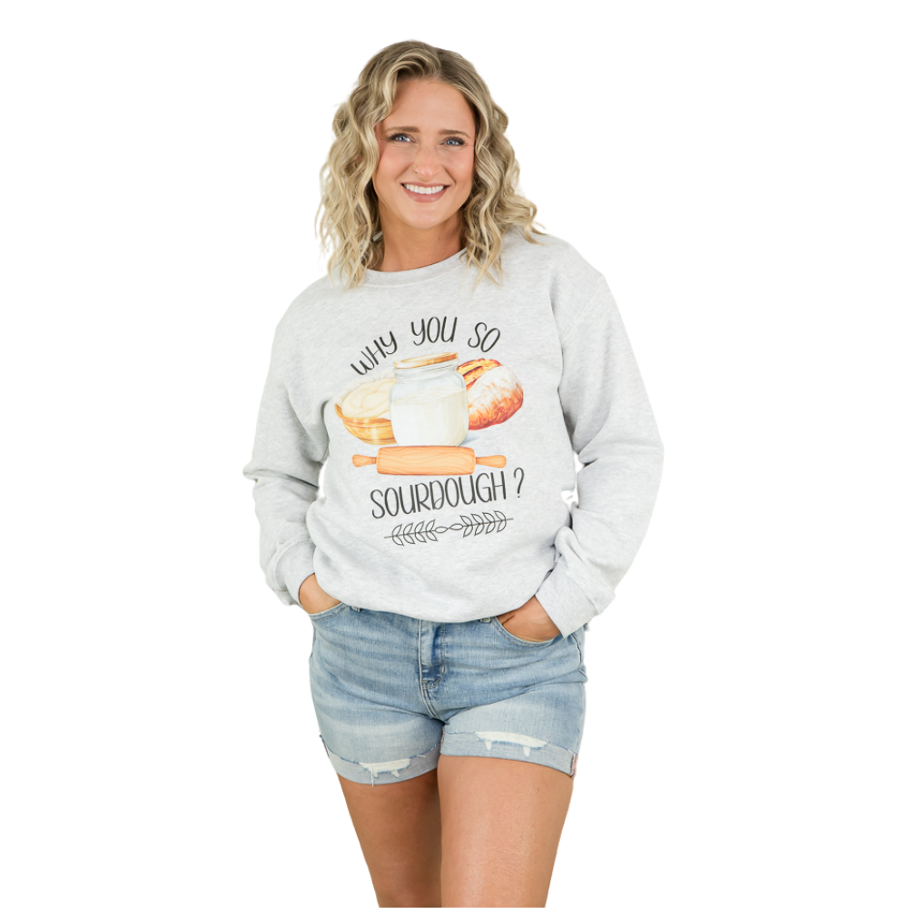 Why you so sourdough? I am just over here minding my own business making all the delicious bread.  Wear this comical gray crewneck sweatshirt year round while feeding your most recent batch of dough.