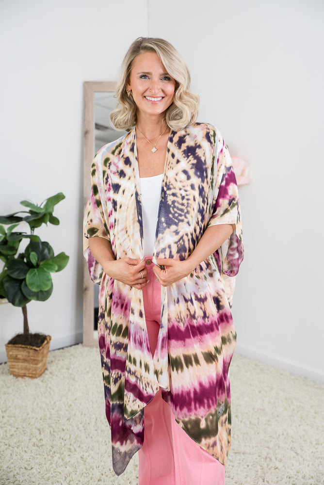 Add this stunning kimono to your next outfit! The kimono has a beautiful tie dye print with shades of yellow and pink. This lightweight kimono looks incredible with a solid top and our Tickled Pink Judy Blue Jeans.