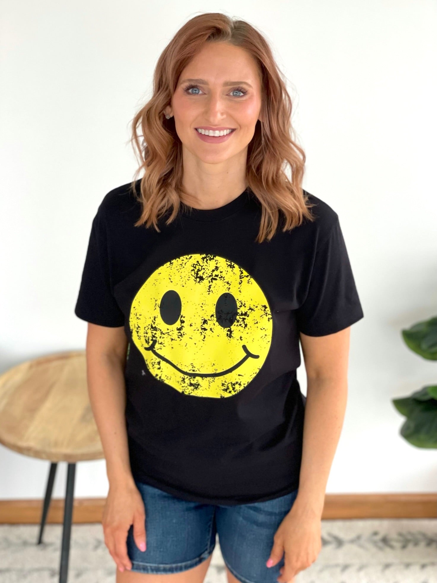 The vintage smiley face is a look you can wear any day of the week. Wear this tee with leggings or denim and spreads smiles everywhere you go.
