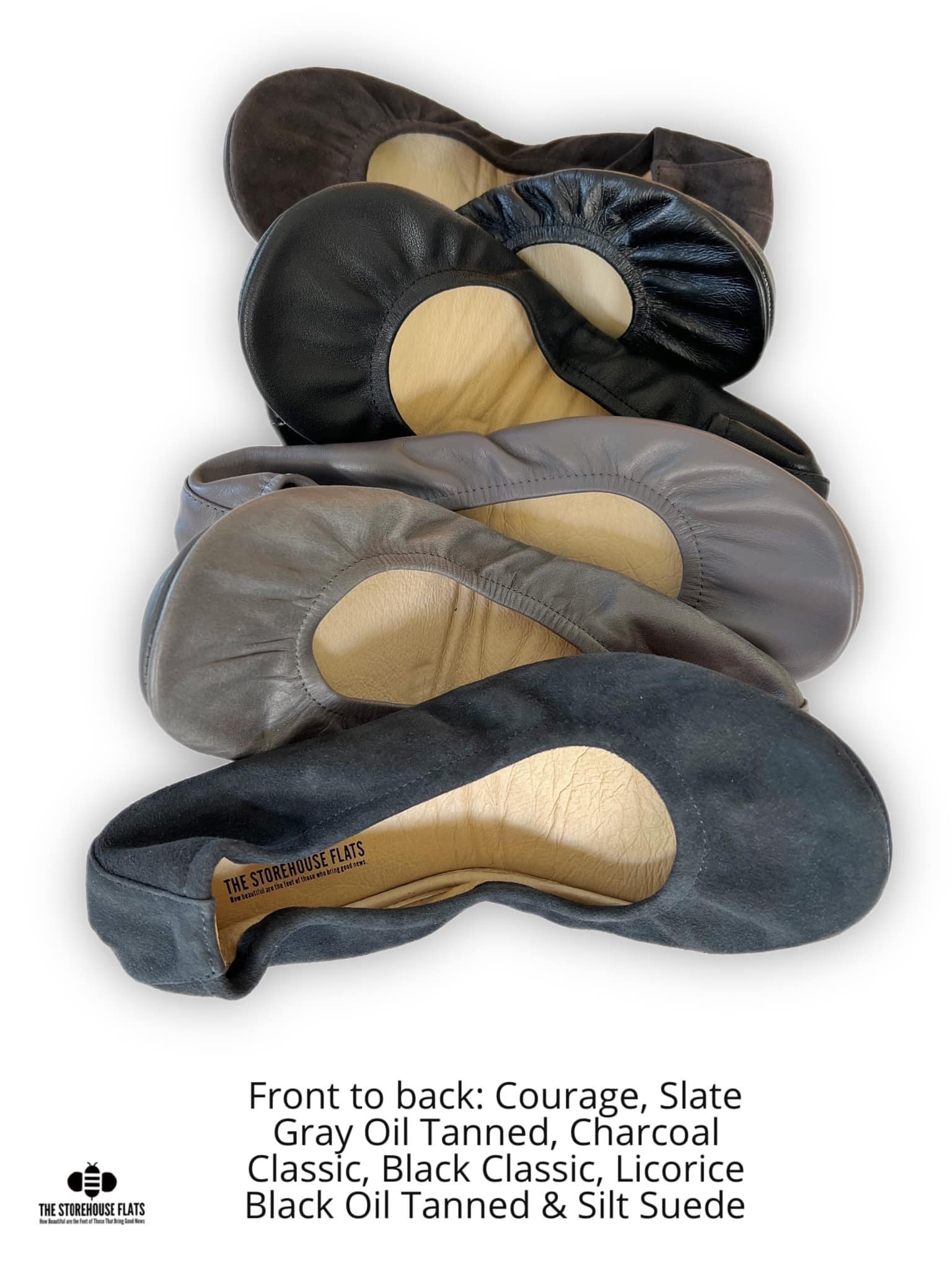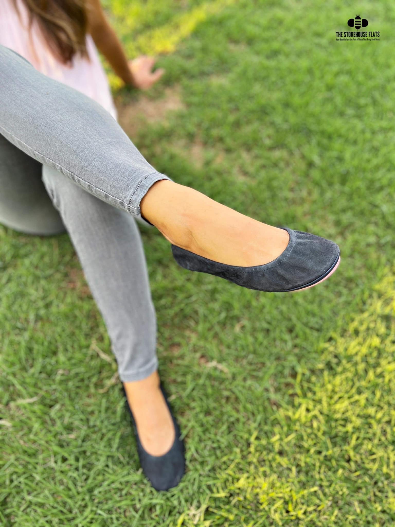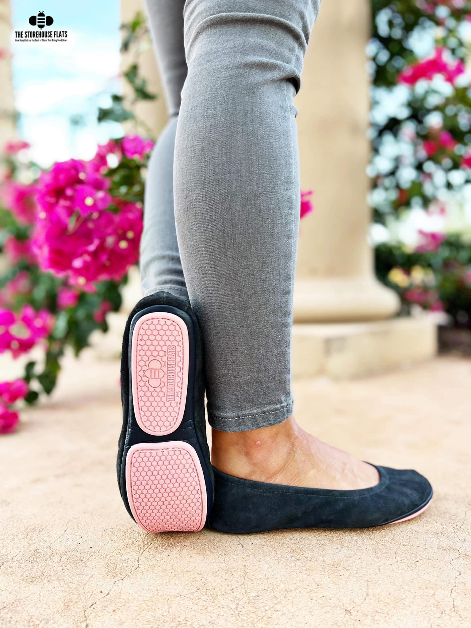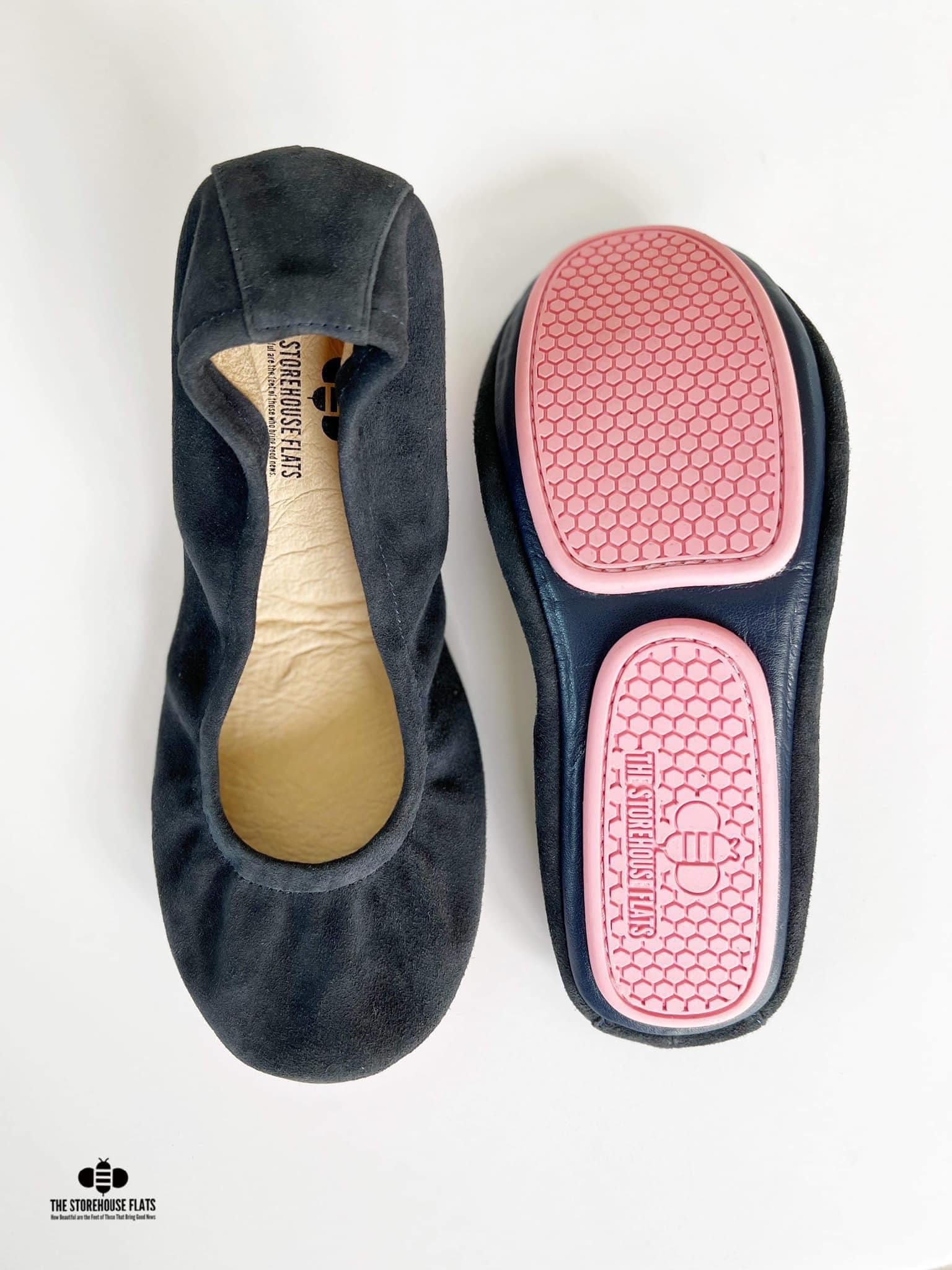 Dark charcoal Gray Suede with light pink soles. These are perfect for year round wear but also a great way to join Breast Cancer Awareness month.