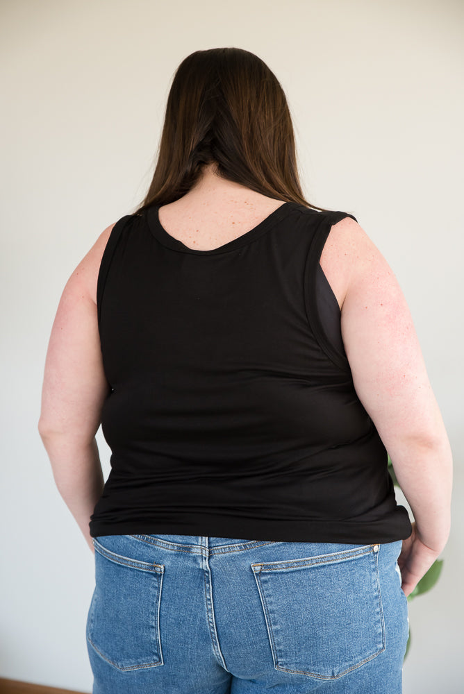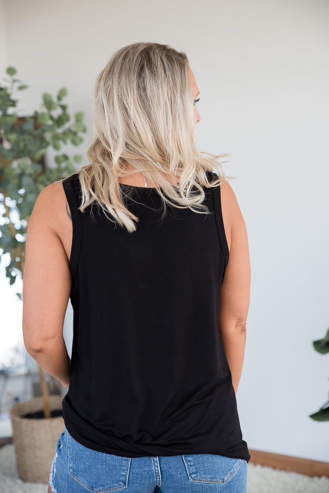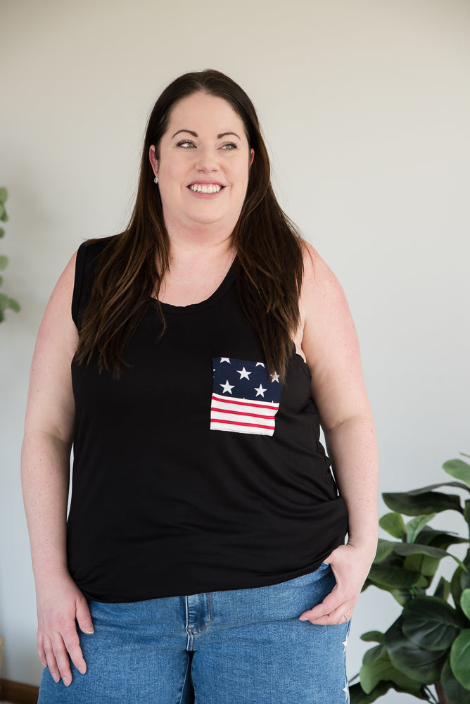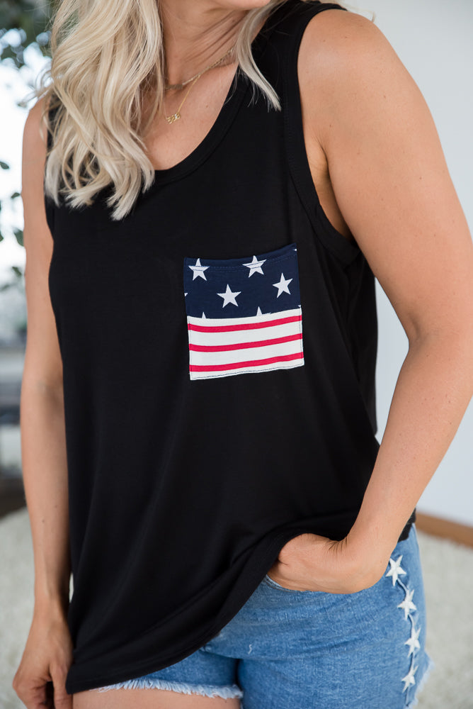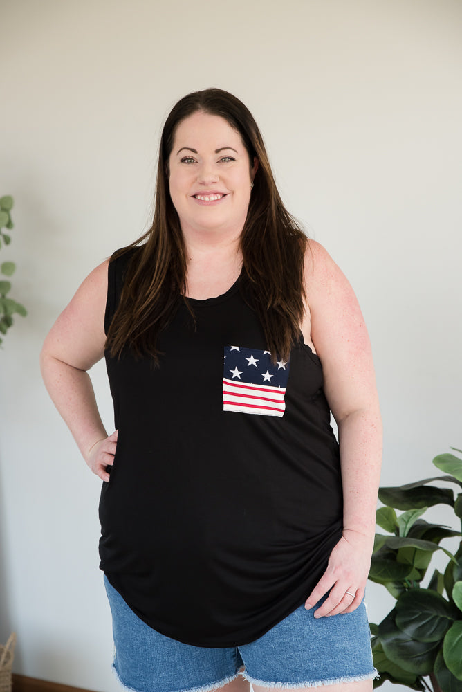 This solid black tank has a front pocket detail perfect for summer! The pocket has a star and stripe print on it that is a perfect pairing with our Follow the Stars Judy Blue Shorts.