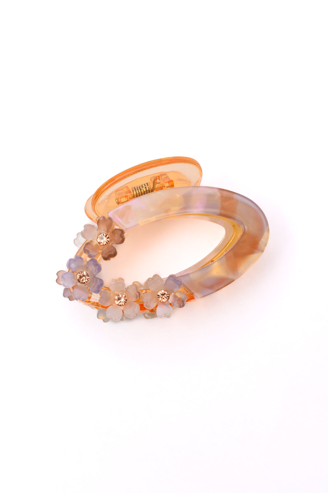 Add a touch of sophistication with the Flower Eclipse Claw Clip. This clip features a semi-translucent peach and white base with beautiful flower accents. A perfect addition to take your outfit to that next level especially in a hurry!