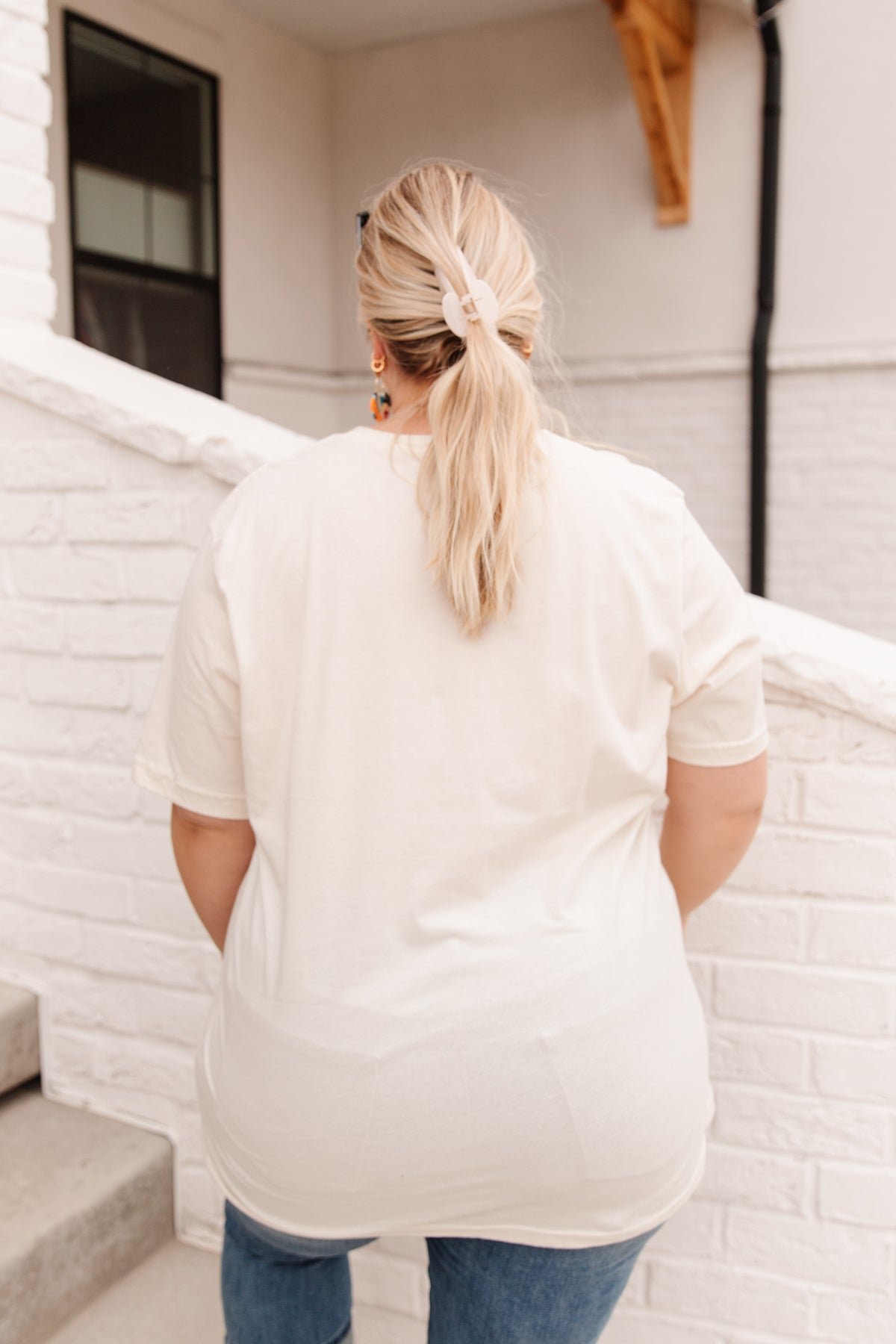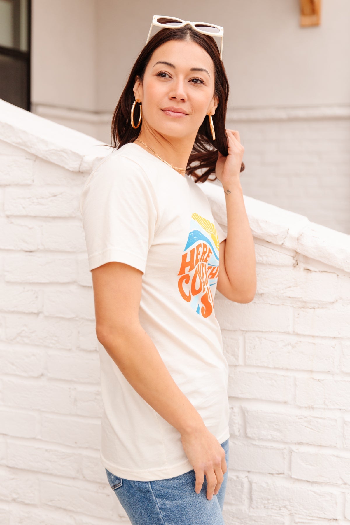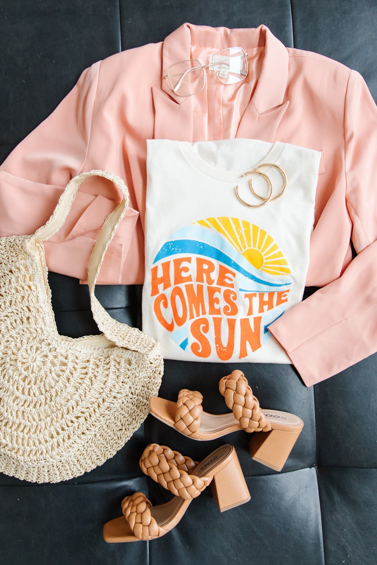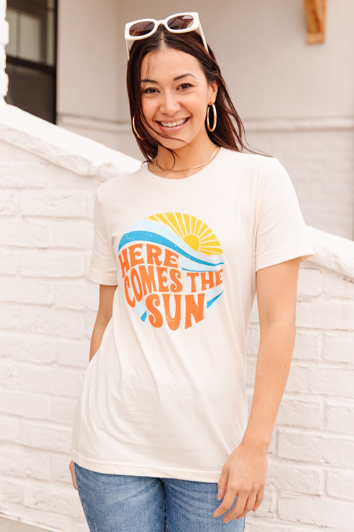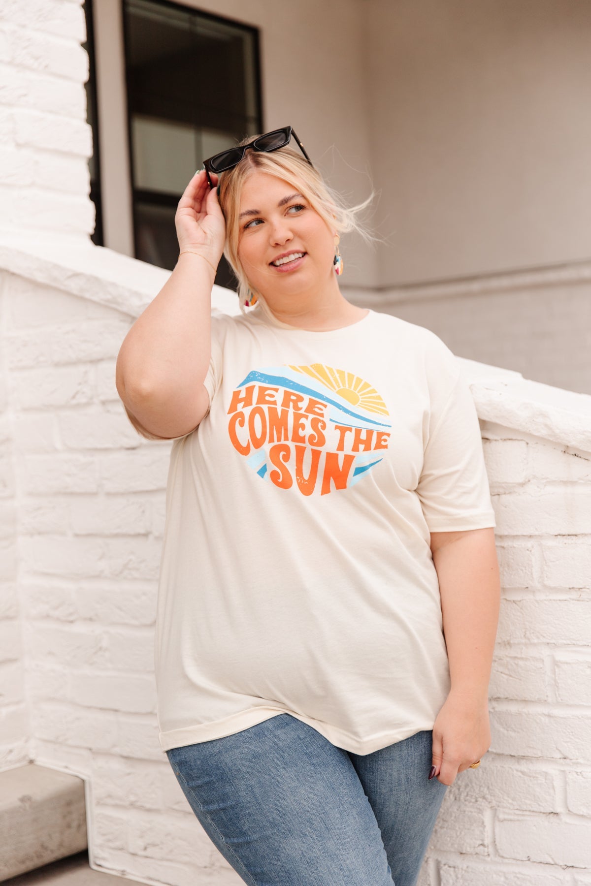 We're spending our summer days in the Here Comes The Sun Graphic Tee! This cute tee can be thrown on over your swimsuit, paired with denim and sneakers, or it can be taken with you on your next adventure! This lightweight tee features a classic crew neckline, and short sleeve cut with a boxy silhouette. We are definitely keeping this tee in our summer rotation!
