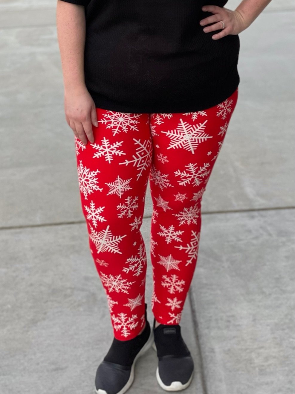 These fun snowflake print leggings are the perfect leggings to wear all season. They pair great with your solid tops and cardigans as cooler weather arrives! The buttery soft leggings pair great with our Bringing Home the Tree Graphic Tee.