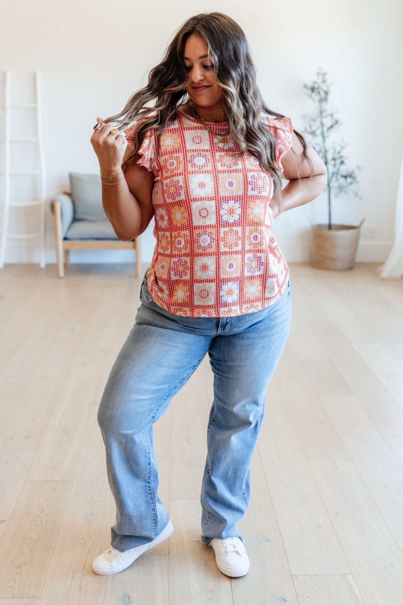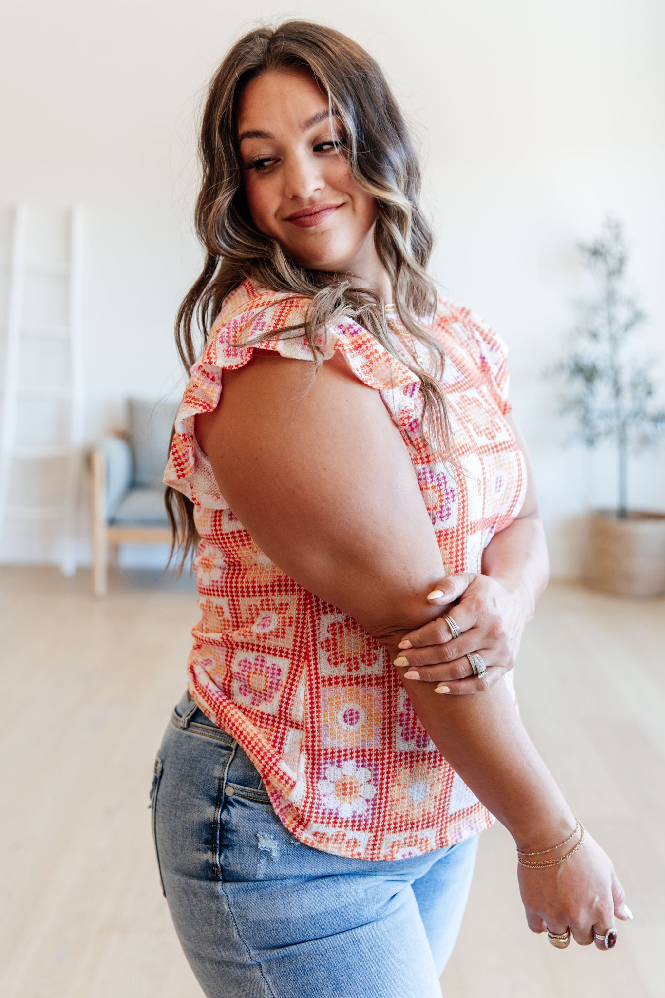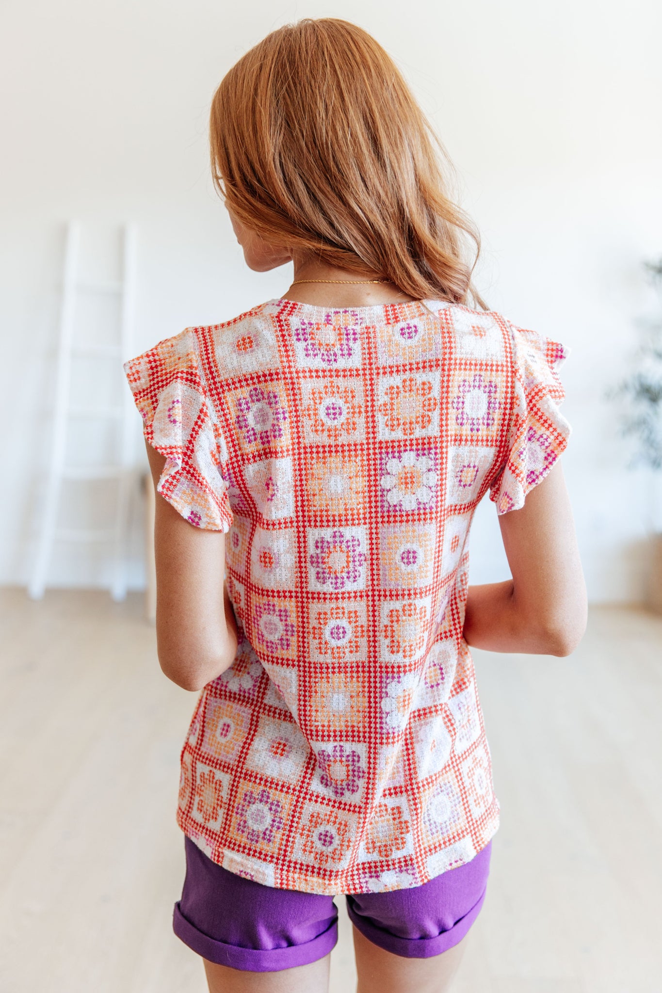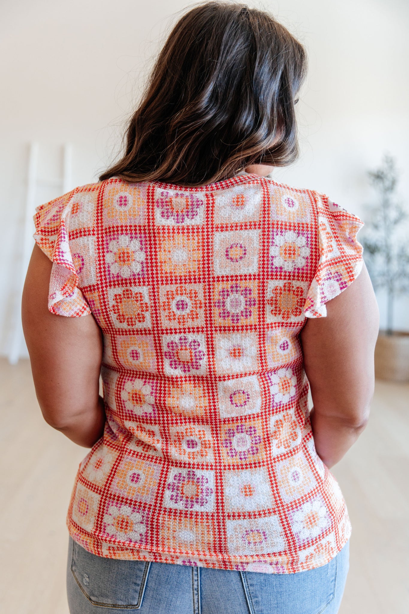 Elevate your style and comfort with our Supermarket Flowers Flutter Sleeve Top! The lightweight waffle knit fabric offers high stretch for a figure-flattering slim fit. The crew neck and ruffle sleeves add a touch of femininity, making this top a must-have in your wardrobe. Order now and bloom with confidence!