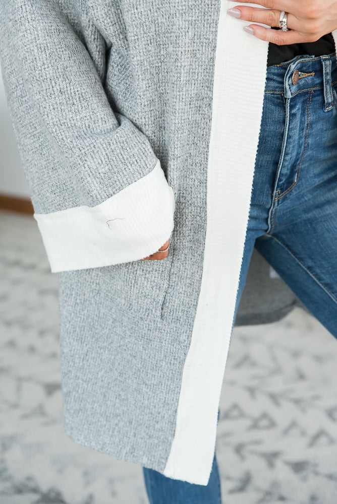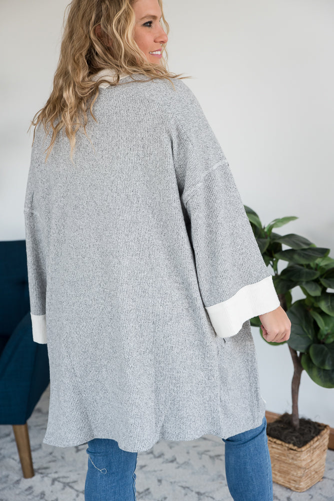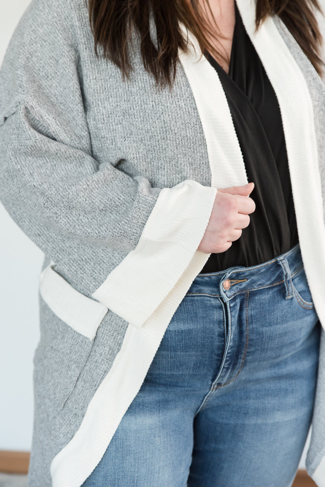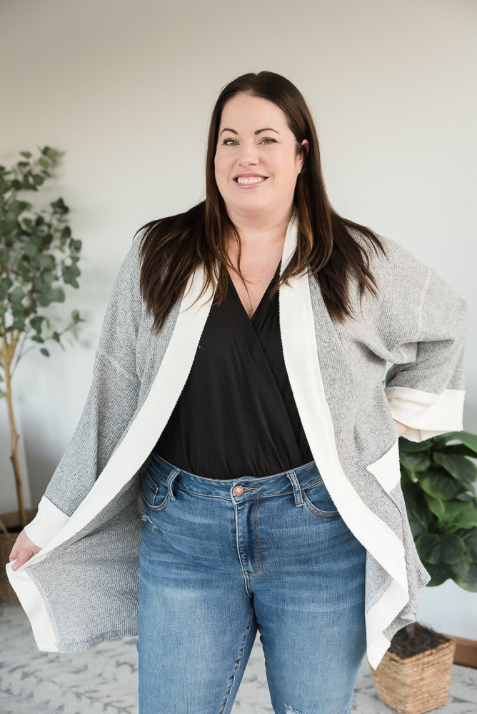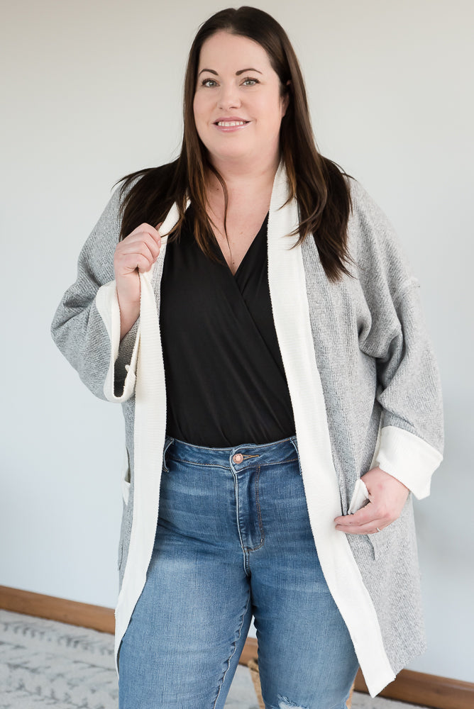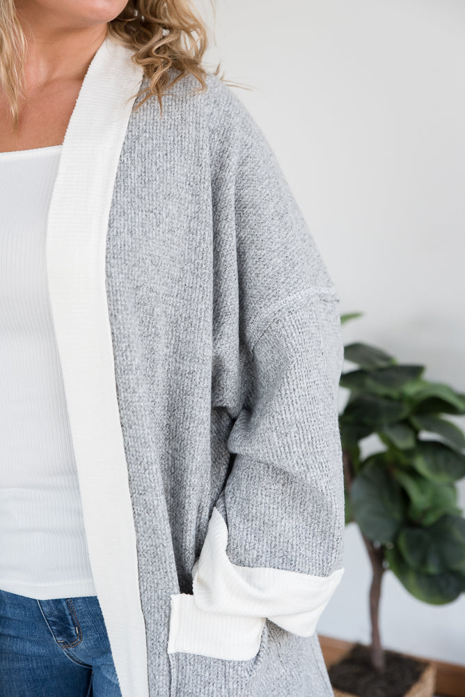 Everyone needs a relaxed fit cardigan they can wear with any of their favorite tops! The gray cardigan with white trim has dropped sleeves and pockets. It pairs great with denim and leggings.