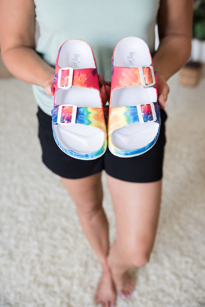 Show off your inner hippie style with these fun and comfortable tie dye Corkys waterslides. Wear at the pool, beach, or any day for the perfect warm weather style for you.